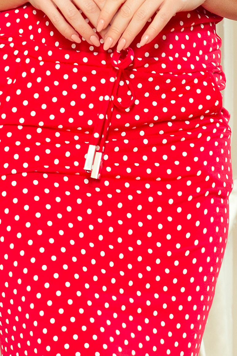 Sportinė suknelė su kaklaraiščiu priekyje, kišenėmis, laivelio formos iškirpte ir 3/4 rankovėmis – raudona su baltais taškeliais. Pagaminta Lenkijoje. Pagaminta iš malonios liesti elastingos medžiagos. Prekės ženklas numoco.