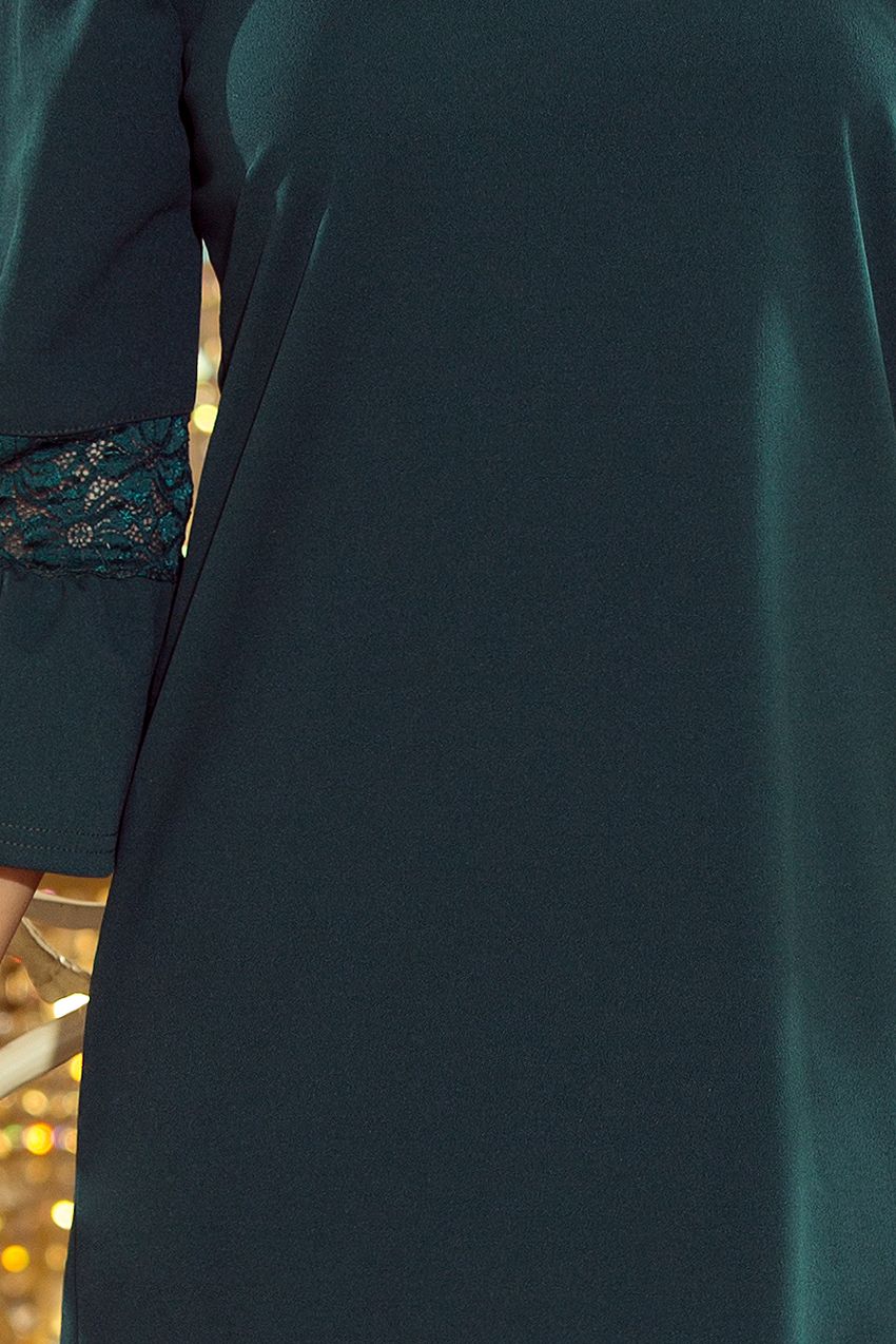 Margaret suknelė platėjančiomis rankovėmis ir nėrinių intarpu – labai patogi ir nevaržanti – tamsiai žalia. Prekės ženklas numoco. Pagaminta Lenkijoje.