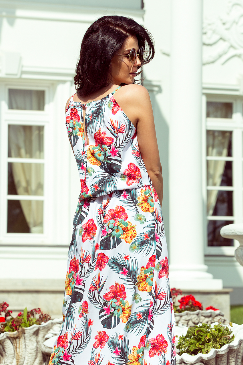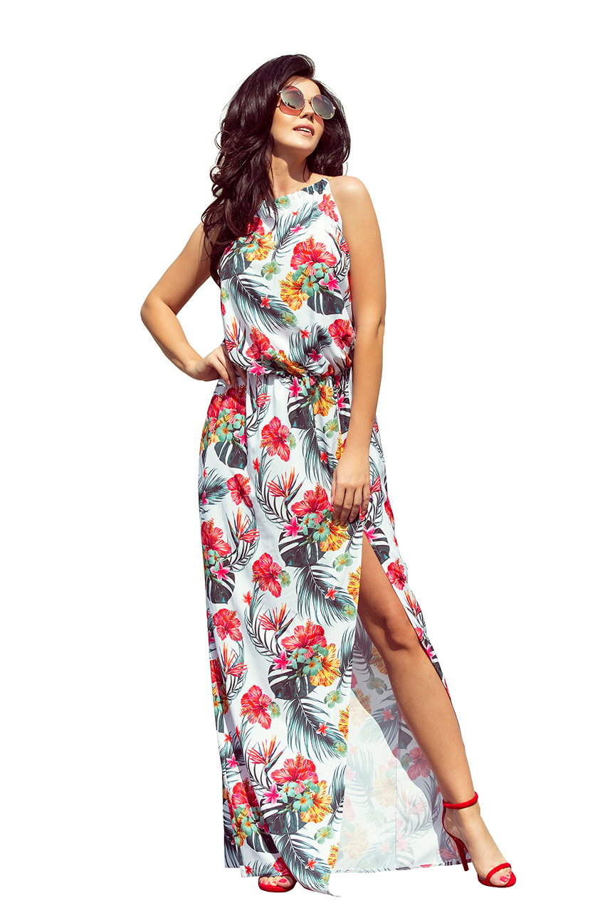 Ilga erdvi maksi suknelė su kojų prakirpimu – surišama ties kaklu. Pasiūta iš malonaus liesti audinio su spalvingomis gėlėmis baltame fone. Prekės ženklas numoco. Pagaminta Lenkijoje.