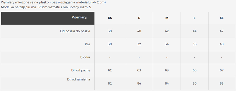 Nuotraukoje pavaizduotas modelis yra 170 cm ūgio ir dėvi S dydį.