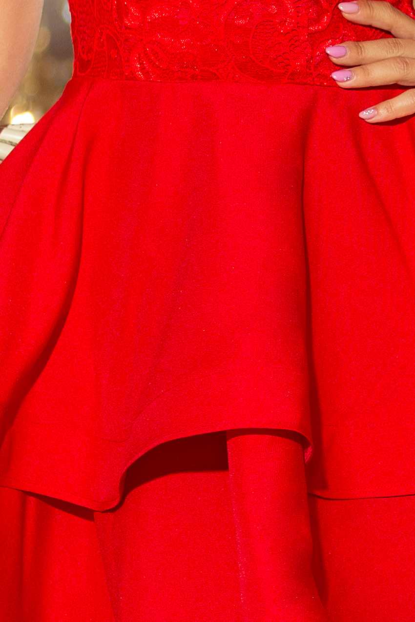 LAURA – suknelė su smarkiai platėjančiu sijonu ir nėriniais – raudona. Užsegama nugaroje dengtu užtrauktuku. Prekės ženklas Numoco. Lenkiškas gaminys.