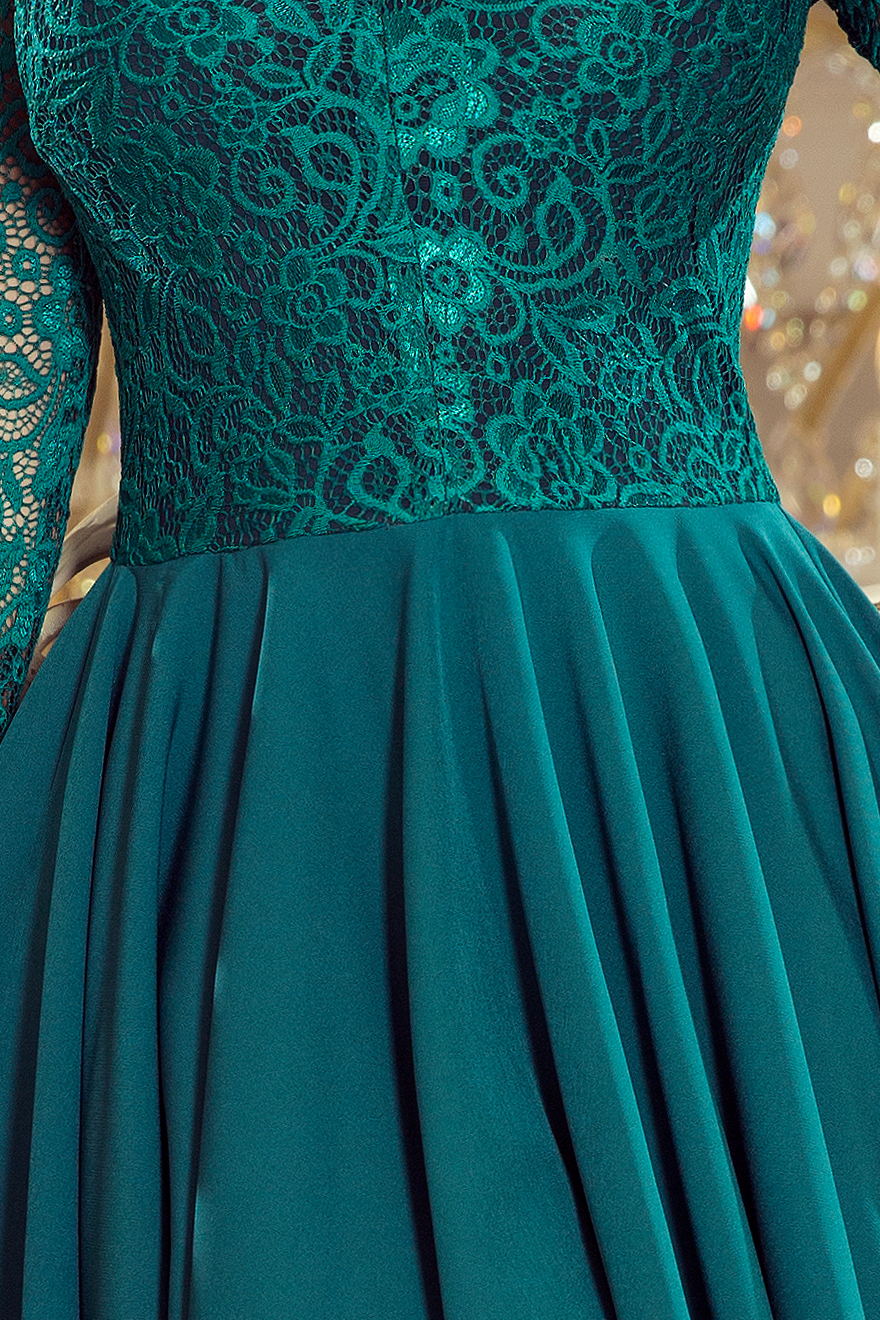 Nicolle – asimetriška žalia išskirtinė suknelė su ilgesne nugara, 3/4 rankovėmis, iškirpte ir nėriniais. Suknelė su ilgesne nugara puikiai tiks šokiams. Lenkiškos gamybos. Prekės ženklas numoco.