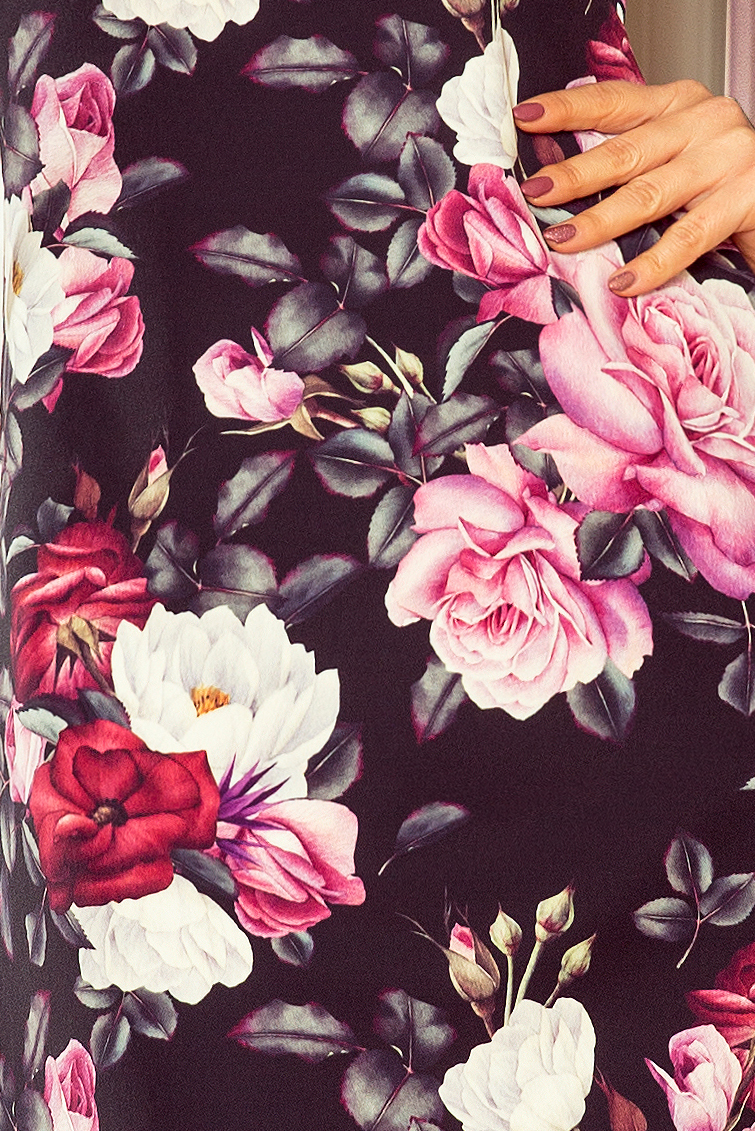 Neva – patogi trapecijos formos suknelė su platėjančiomis rankovėmis ir lankeliais – labai moteriška. Juoda su spalvingomis gėlėmis. Lenkijos gaminys. Prekės ženklas numoco.