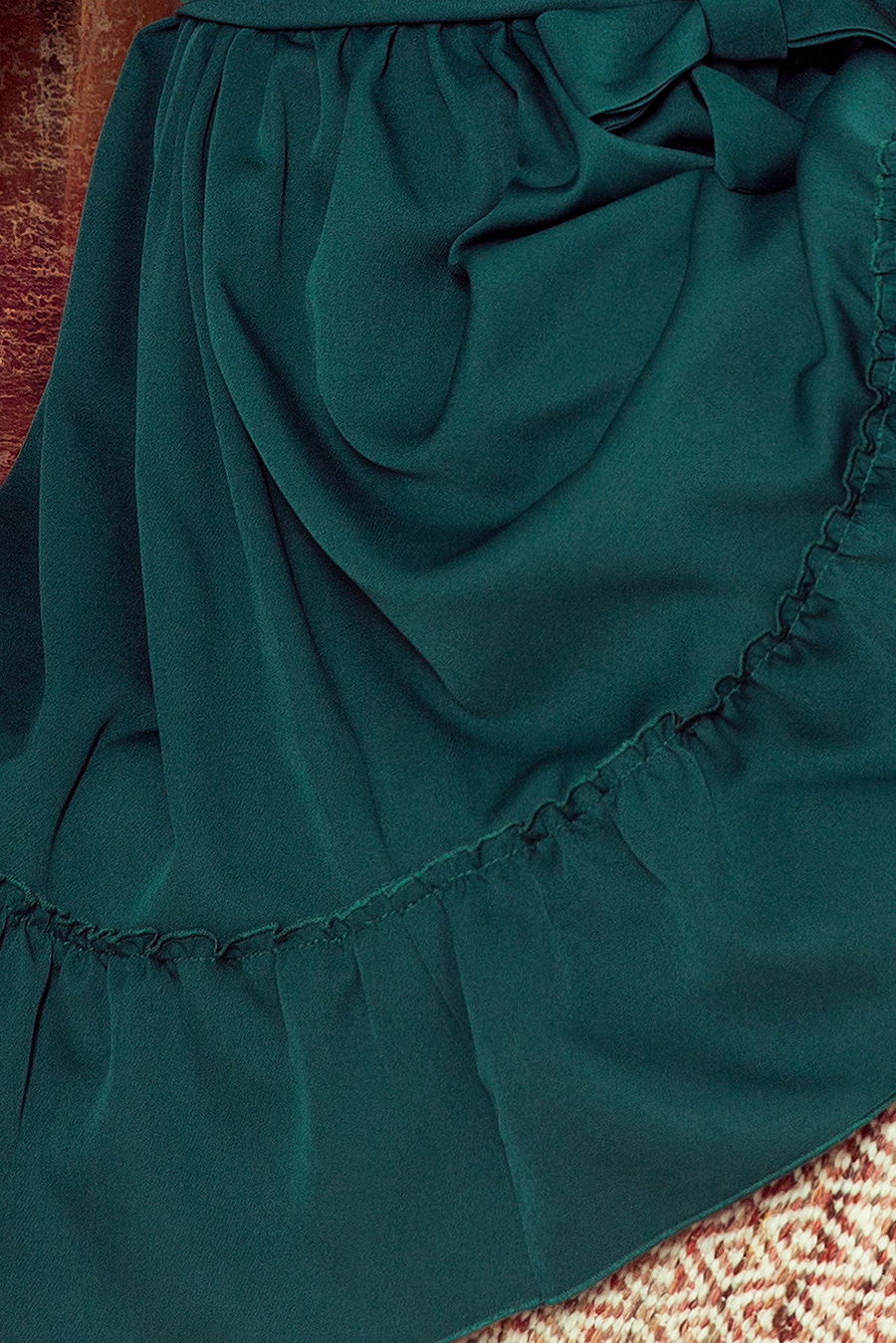 DAISY Suknelė su raukiniais ir diržu butelio žalios spalvos. Ant pečių, liemens ir rankovių prisiūta elastinė juosta. Pagaminta numoco. Lenkų gamybos.