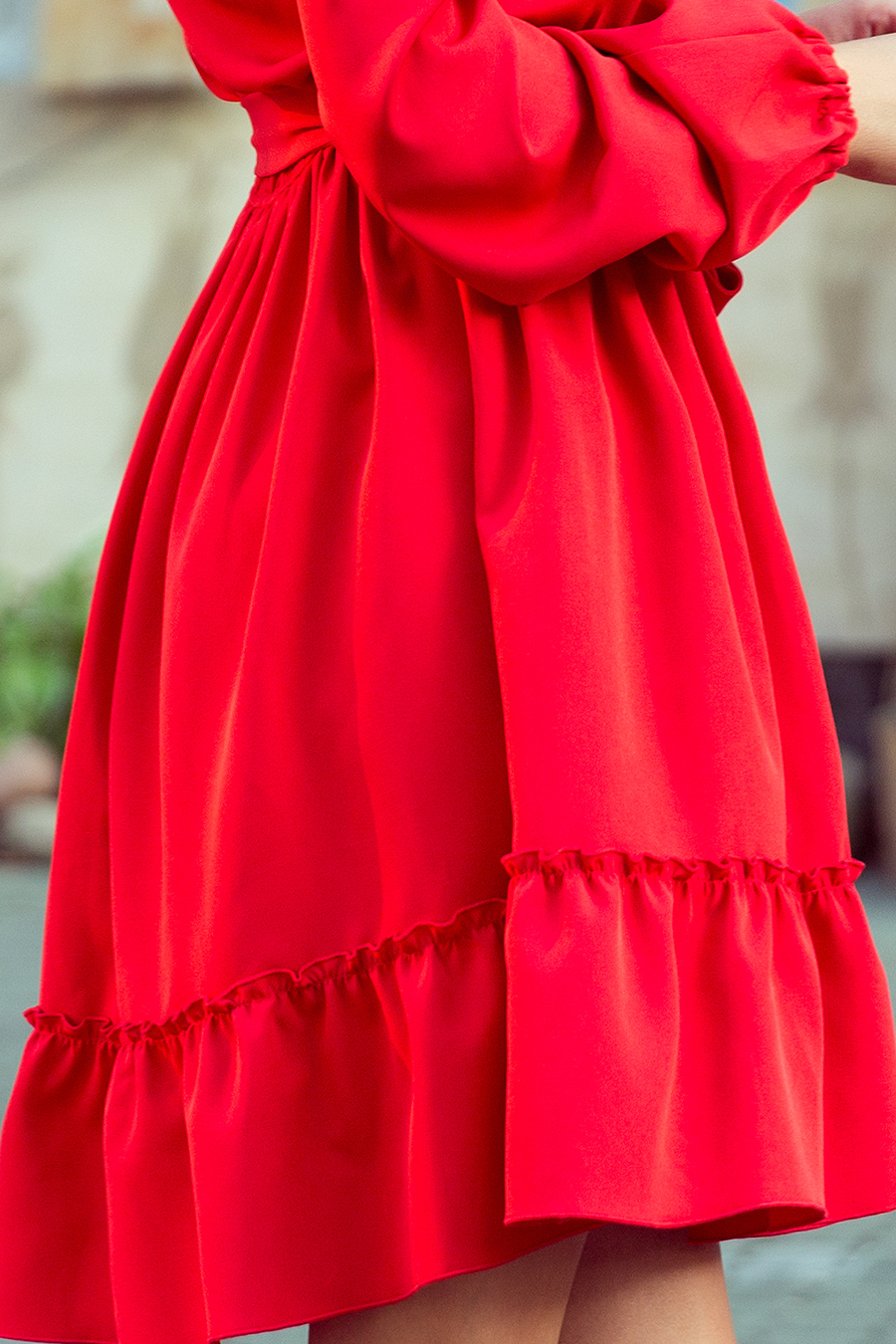 DAISY Raudonos spalvos suknelė su raukiniais ir diržu. Ant pečių, liemens ir rankovių prisiūta elastinė juosta. Pagaminta “Numoco”. Pagaminta Lenkijoje.
