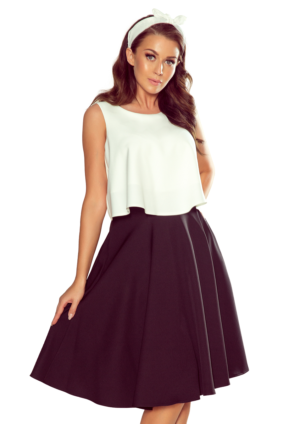 Rozkloszowana czarna spódnica midi z kieszonkami. Uszyta z przyjemnego w dotyku, gładkiego materiału (95% poliester, 5% elastan). Zapinana z tyłu na zamek. Bluzka z kompletu jest do kupienia osobno. Marka numoco.