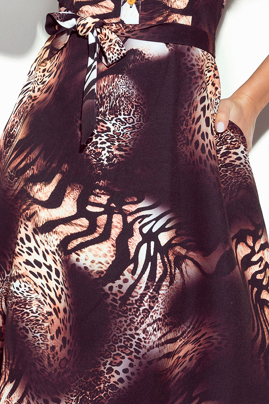SANDY Leopardo rašto suknelė su raukiniais. Pasiūta iš malonios liesti, mažai elastingos medžiagos (95 % poliesteris, 5 % elastanas). Prekės ženklas numoco.