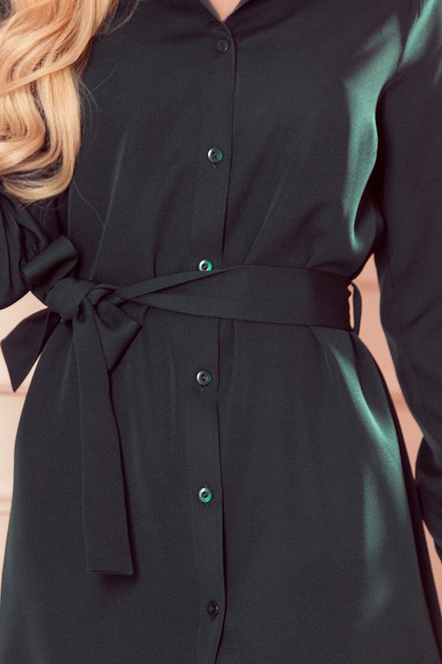 Marškinių suknelė su sagomis, kurios atsegamos iki pat apačios – butelio žalios spalvos. Ją taip pat galima dėvėti atsegtą kaip paltą. Pasiūta iš malonios liesti, mažai elastingos medžiagos (95 % poliesteris, 5 % elastanas). Prekės ženklas numoco.