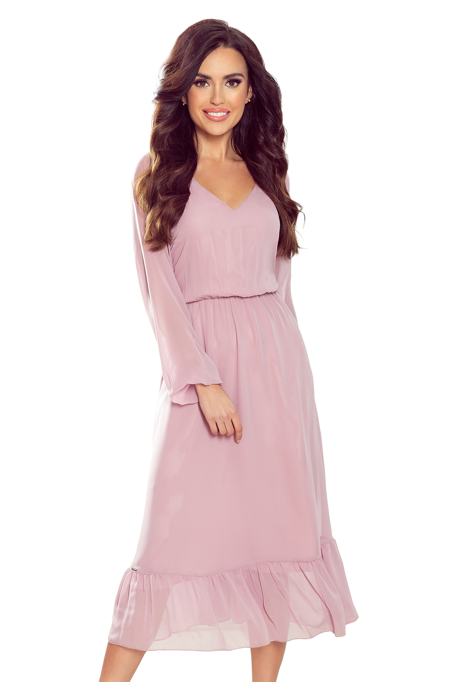 Erdvi šifono midi suknelė su iškirpte ir raukiniais – purvinai rožinė spalva. Pagaminta Lenkijoje. Prekės ženklas Numoco.