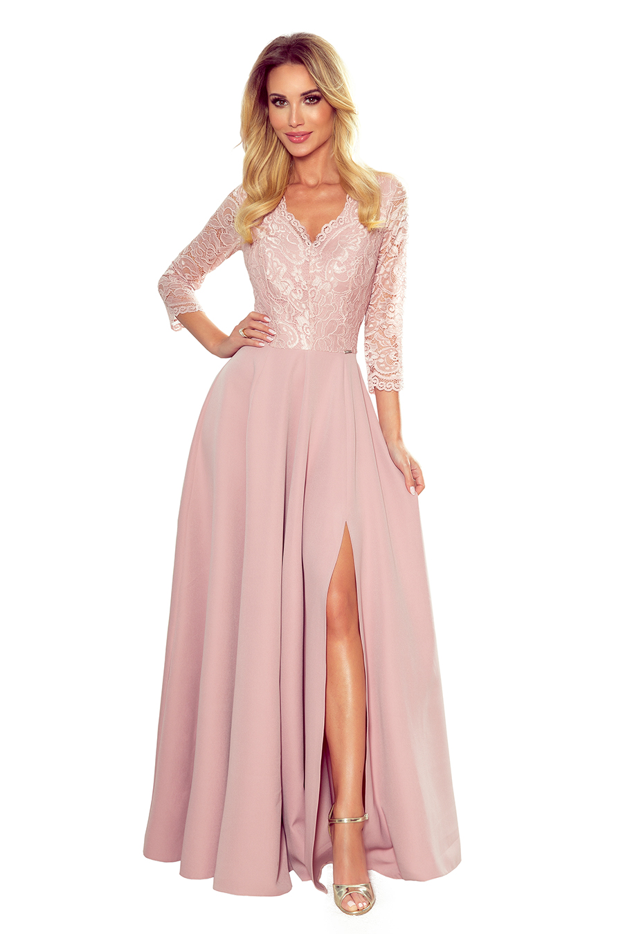 Amber – elegantiška ilga margaspalvė suknelė su saldžia iškirpte. Gražios formos iškirptė ir sijono skeltukas sukuria neįprastą purvinai rožinės spalvos kūrinį. Pagaminta Lenkijoje. Prekės ženklas Numoco.