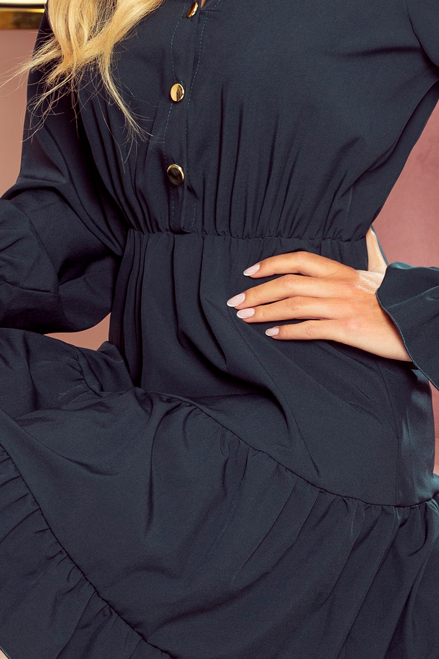332-1 Suknelė su falbanomis ir auksiniais mygtukais – BUTELIO ŽALUMA