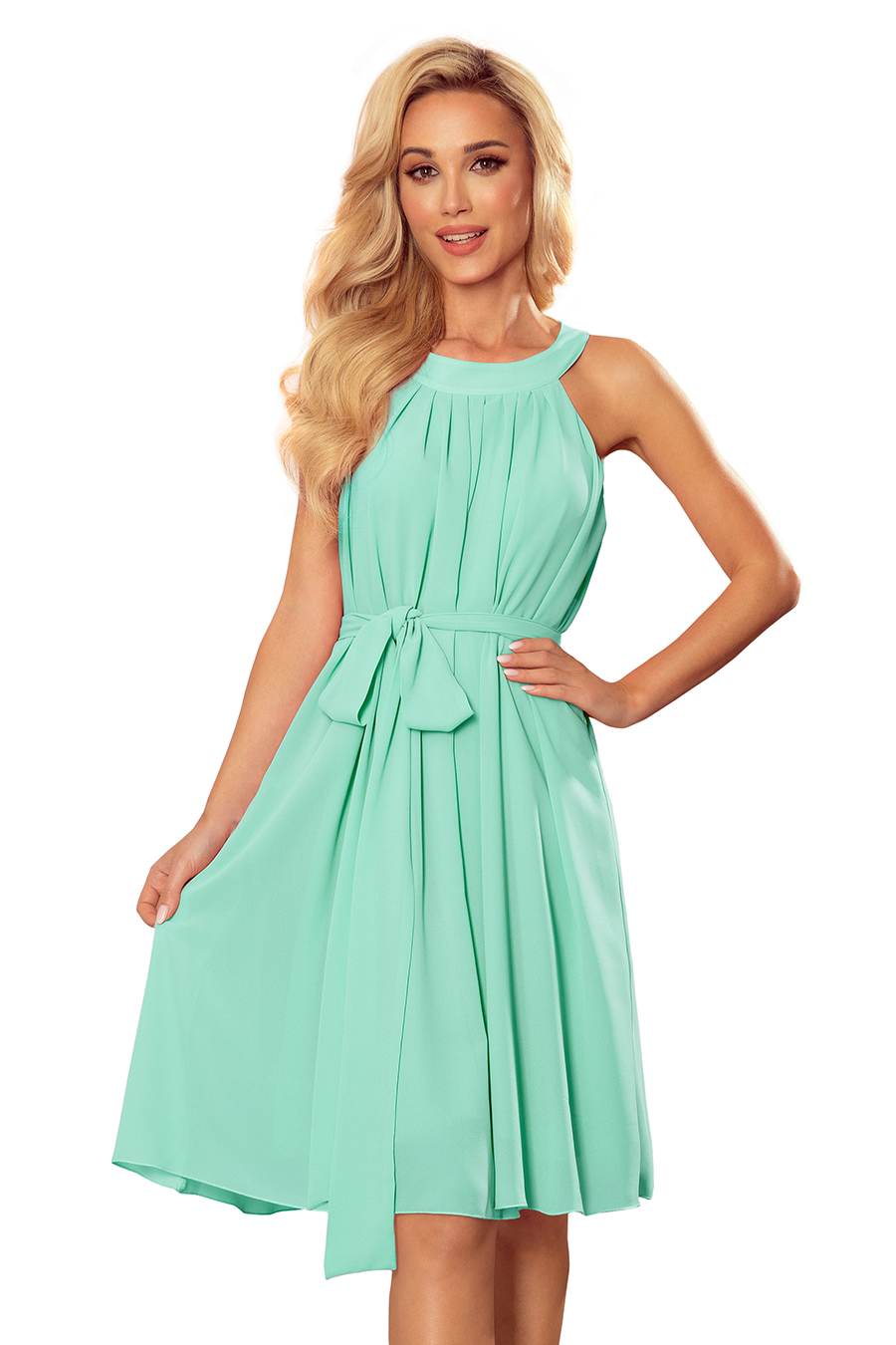 Alizee – šifoninė suknelė su diržu ir kaklaraiščiu nugaroje. Spalva: mėtų. Prekės ženklas numoco. Pagaminta Lenkijoje.