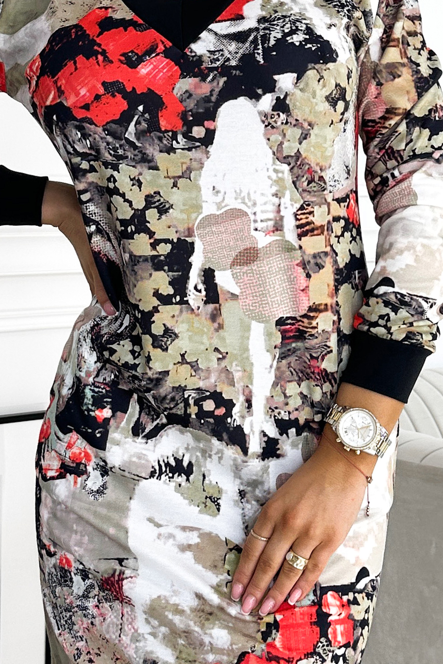 Elvira – patogi suknelė ilgomis rankovėmis ir iškirpte – spalvingas raštas. Lenkijos gaminys. Pagaminta iš malonios liesti elastingos medžiagos. Prekės ženklas numoco.